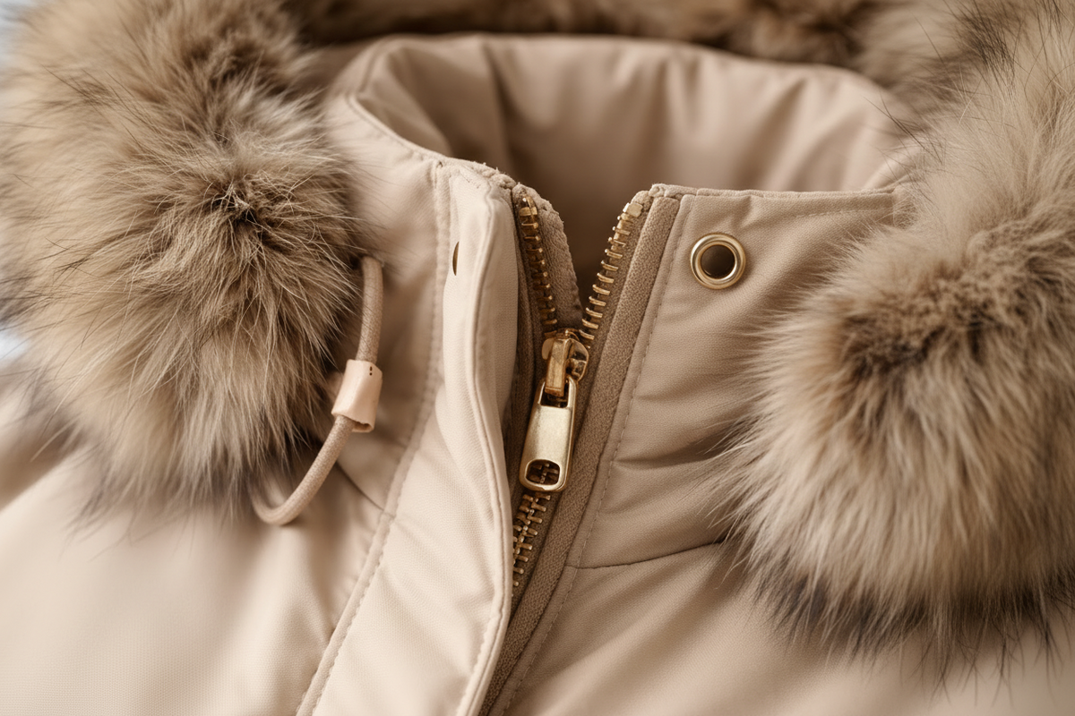 Kapuze mit Felloptik, Reißverschluss, Seitentaschen, leicht gefüttert